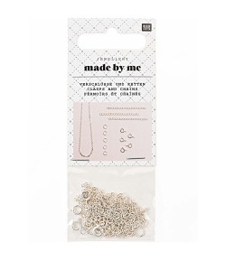 Sachet contenant 14 pièces en métal argenté pour bijoux composé de 5 fermoirs ressorts, 5 anneaux, 1 m de chaîne et 3 chaînes d'extension de 5 cm.
