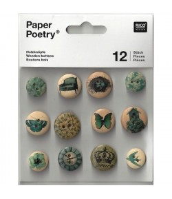 Lot de 13 boutons différents en bois coloré. 2 trous. Dimensions : environ 2.1 x 3 cm.