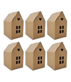 Set de 6 maisonnettes en papier kraft cartonné à monter et à customiser. Dimensions d'une maisonnette : 5,5 x 9,5 x 7 cm. Les maisonnettes sont pré-pliées, s'ouvrent et se referment par le toit. Vous pouvez les utiliser comme décoration pour un centre de table, emballage cadeau, calendrier de l'Avent, etc...