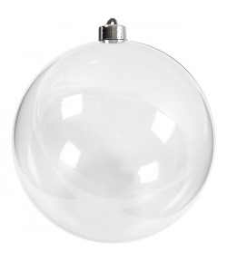 Boule en plastique transparent avec séparateur en carton blanc et accroche en plastique argenté. Diamètre : environ 13.6 cm.