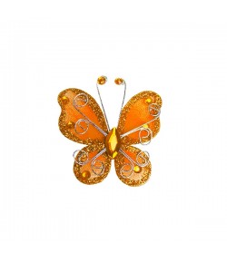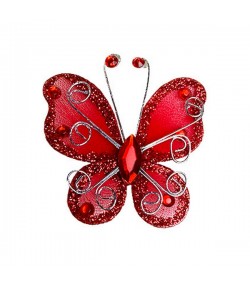 Embellissement papillon avec touches pailletées, fil alu argenté et strass. Dimensions : environ 3 x 3.5 cm.