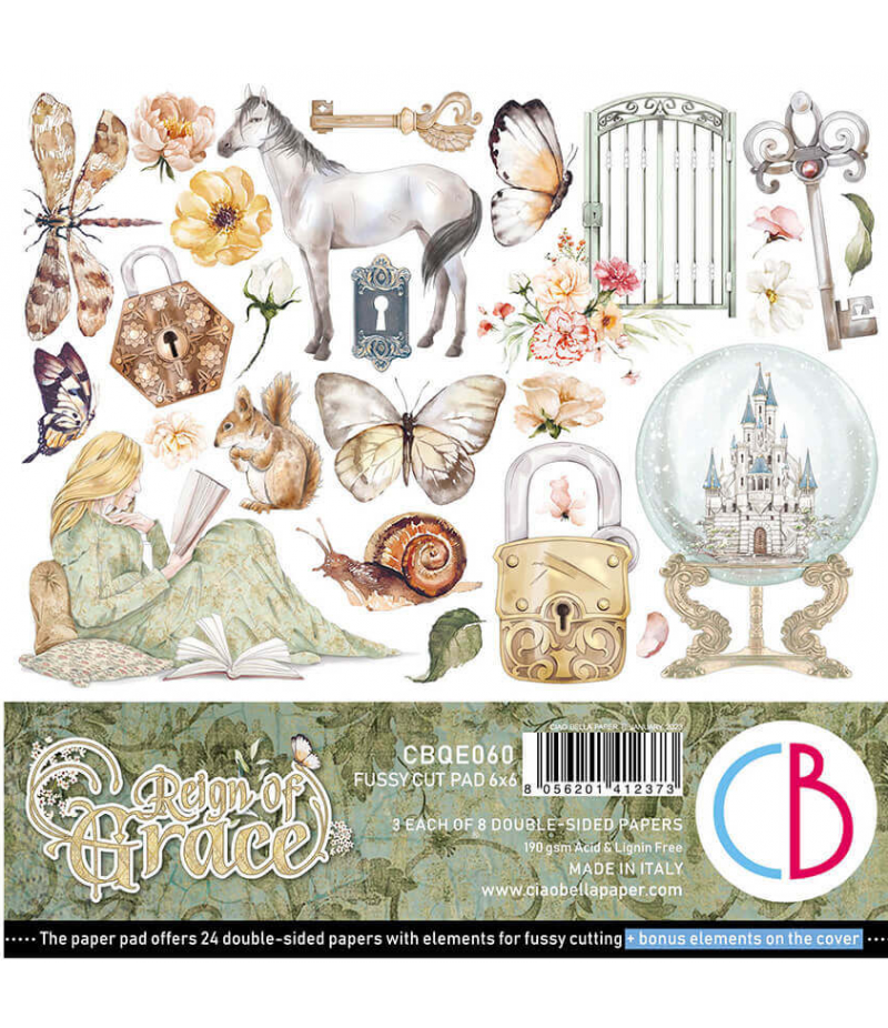 Bloc de 24 feuilles de papier double face (2 motifs) sans acide. Collection REIGN OF GRACE de CIAO BELLA. CBQE060.