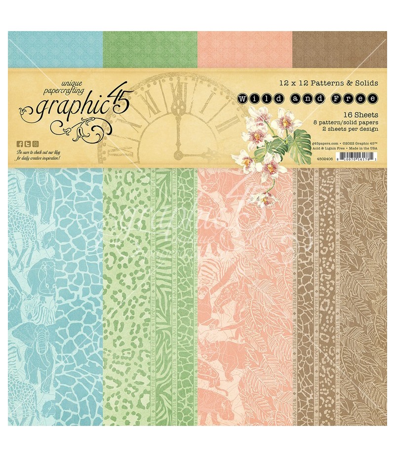 Bloc de 16 feuilles de papier double face (2 motifs) sans acide. 2 feuilles de chacun des 8 motifs et une feuille de stickers assortis. Collection WILD AND FREE de GRAPHIC 45. 4502406.
