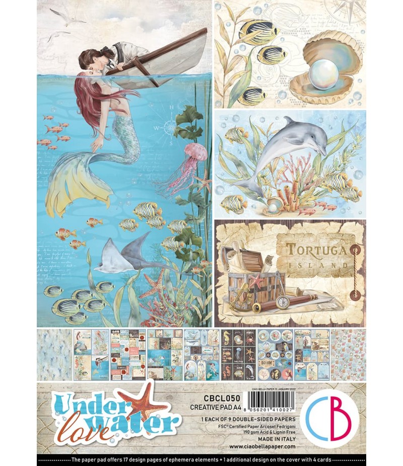 Bloc de 9 feuilles de papier double face (2 motifs) sans acide. Collection UNDERWATER LOVE - CBCL052 CIAO BELLA.