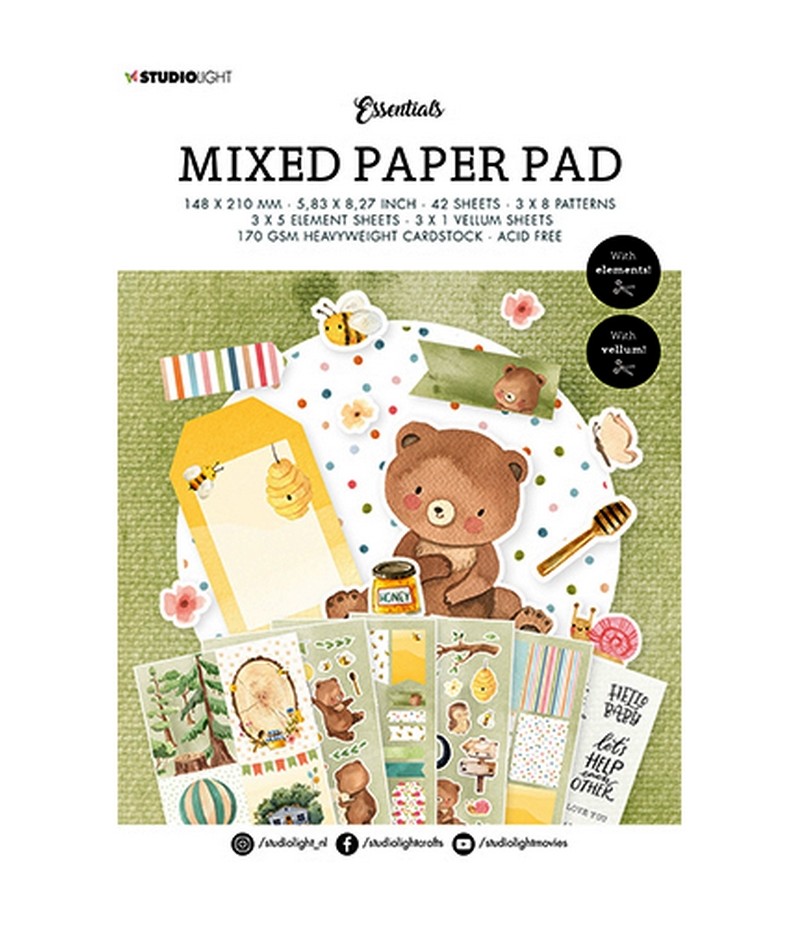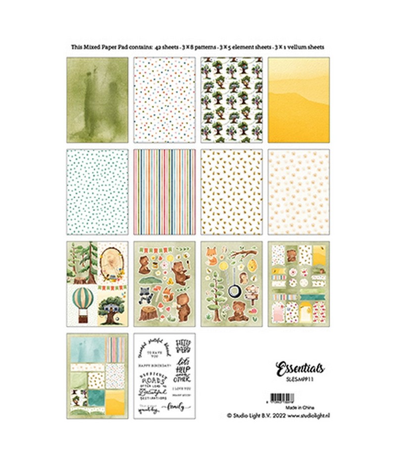 Bloc de 42 feuilles comprenant : 24 papiers imprimés (8 motifs x 3 feuilles), 15 feuilles de dies-cuts et étiquettes à découper (5 motifs x 3 feuilles) et 3 feuilles de papier vellum (1 motif x 3 feuilles).