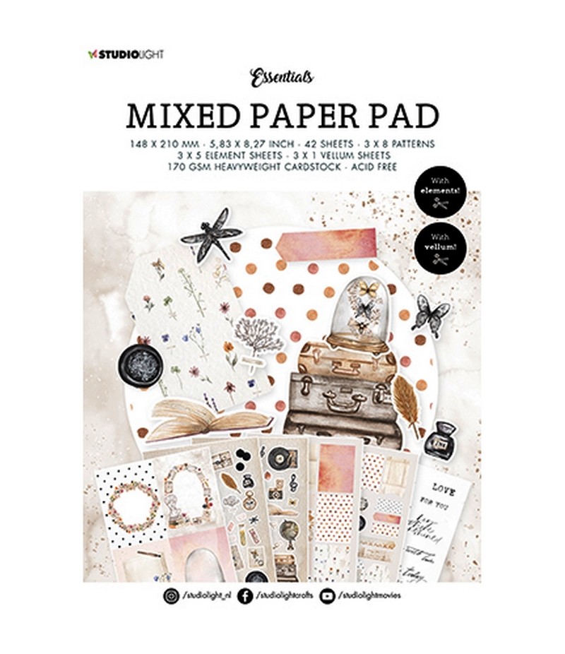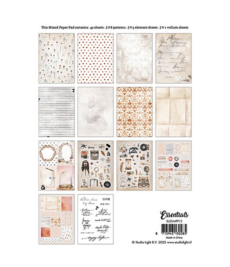 Bloc de 42 feuilles comprenant : 24 papiers imprimés (8 motifs x 3 feuilles), 15 feuilles de dies-cuts et étiquettes à découper (5 motifs x 3 feuilles) et 3 feuilles de papier vellum (1 motif x 3 feuilles).