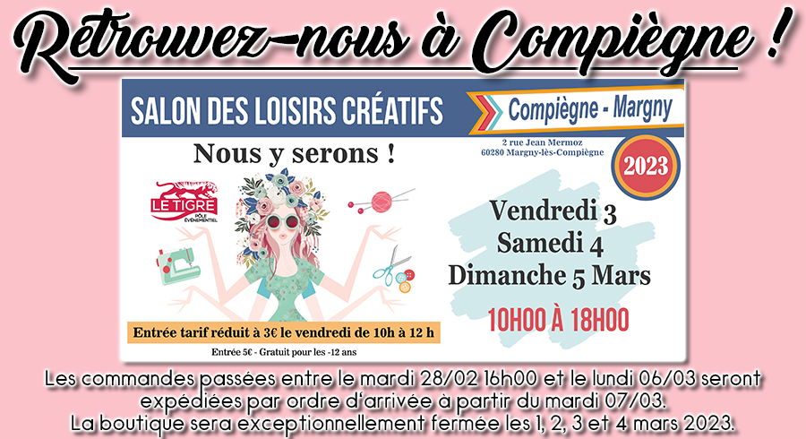 Rendez-vous le vendredi 3, samedi 4 et dimanche 5 mars 2023, de 10h00 à 18h00 au Salon des loisirs créatifs de Compiègne. Nous sommes très contentes de participer à cette première édition, on compte sur vous pour en faire un succès !