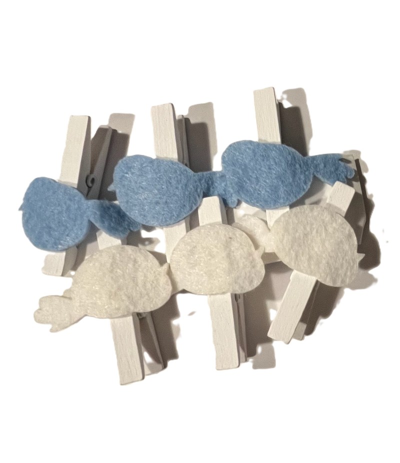 6 pinces a linge en bois blanc avec sujets en feutrine.