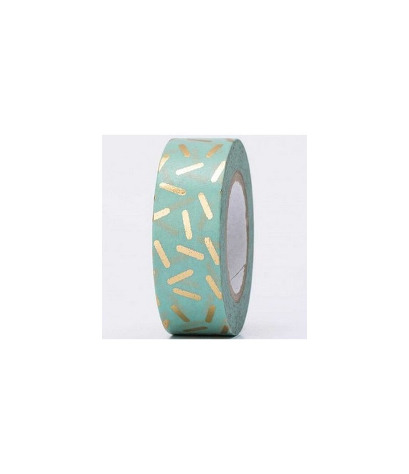 Motifs petits tirets or métallisé. Dimensions : 1.5 cm x 10 m environ