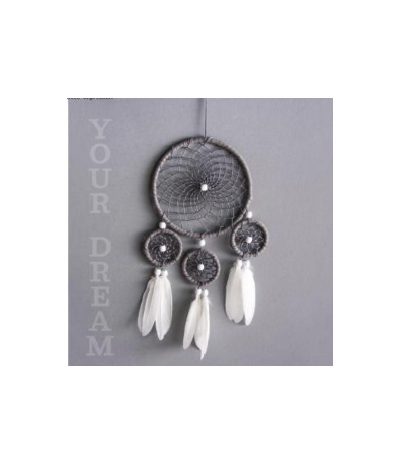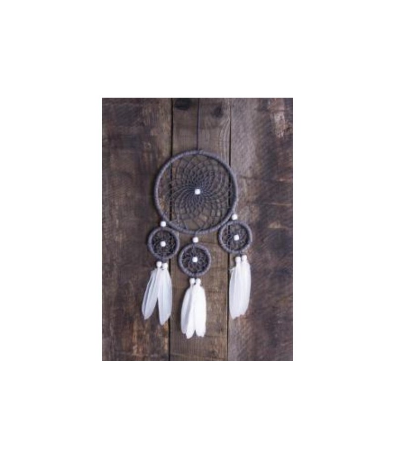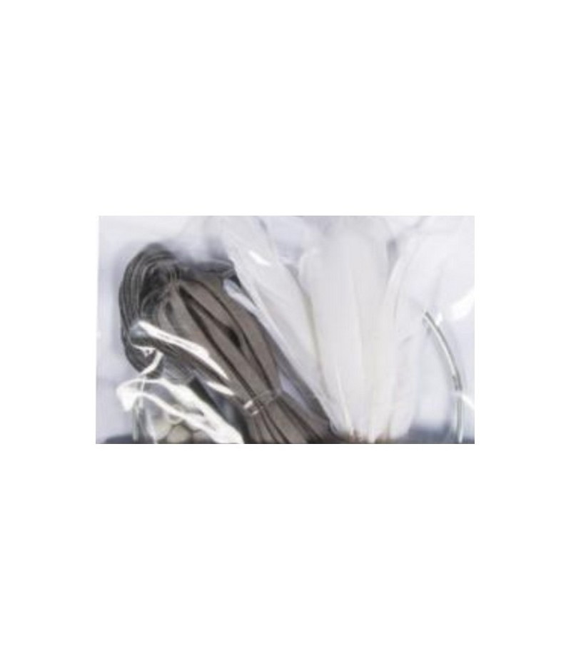 Kit pour réaliser un attrape rêves contenant 4 anneaux, des perles, des plumes, du ruban simili cuir et du fil.