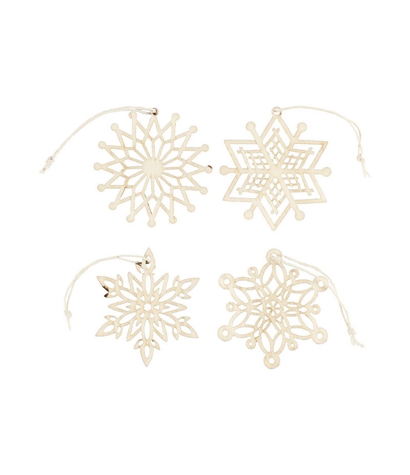 Flocons en bois clair avec bords foncés avec ficelle pour suspendre.