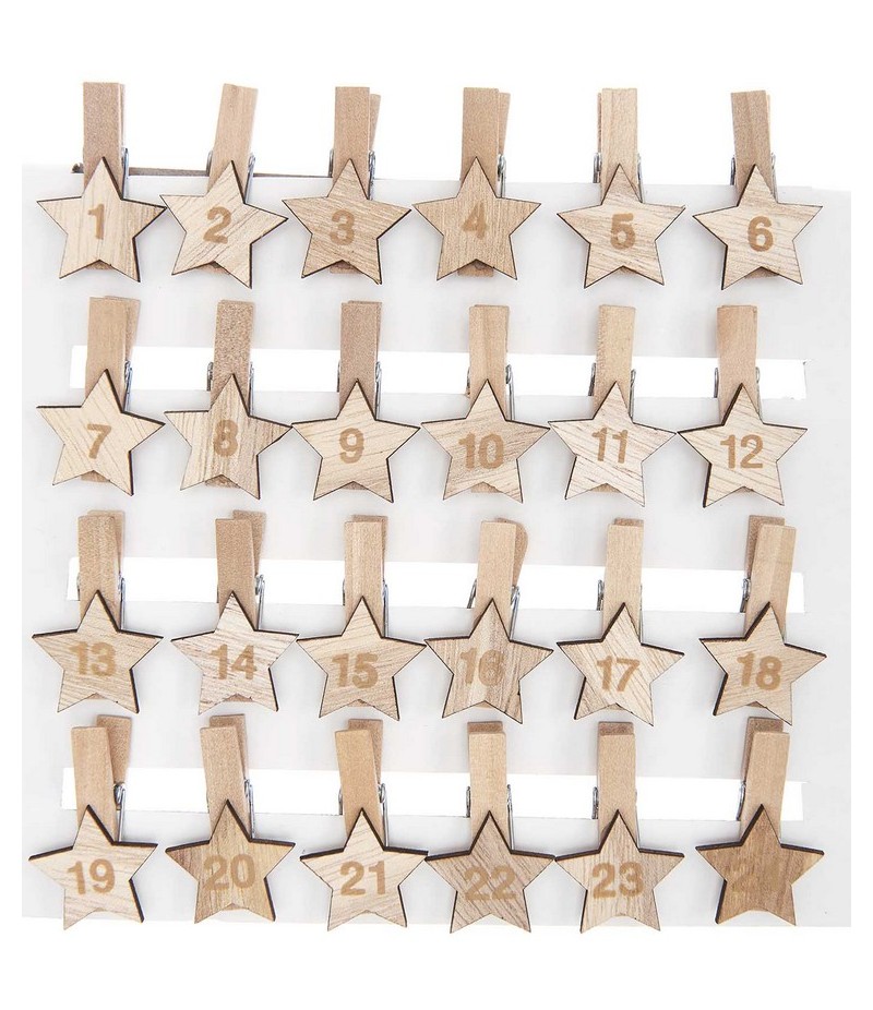 24 Etoiles autocollants en bois sur pinces pour réaliser vos calendriers de l'avent.