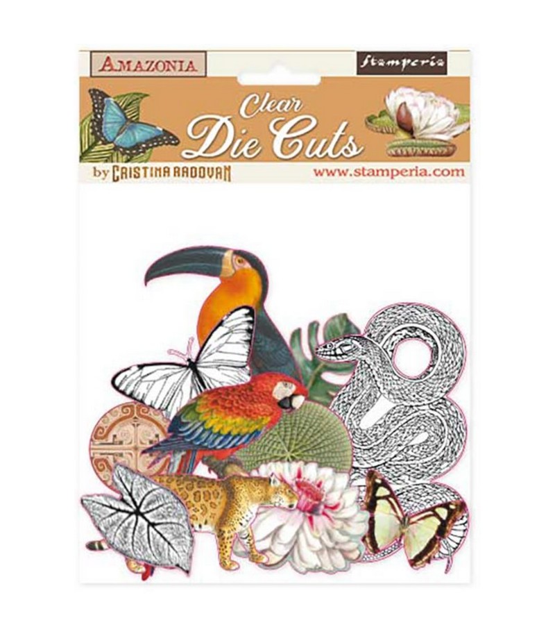 Assortiment de 48 embellissements en acétate coloré. Collection AMAZONIA de STAMPERIA by CRISTINA RADOVAN - DFLDCP03.