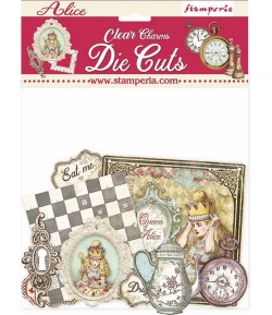 Assortiment de 49 embellissements en acétate coloré. Collection ALICE de STAMPERIA - DFLDCP11.