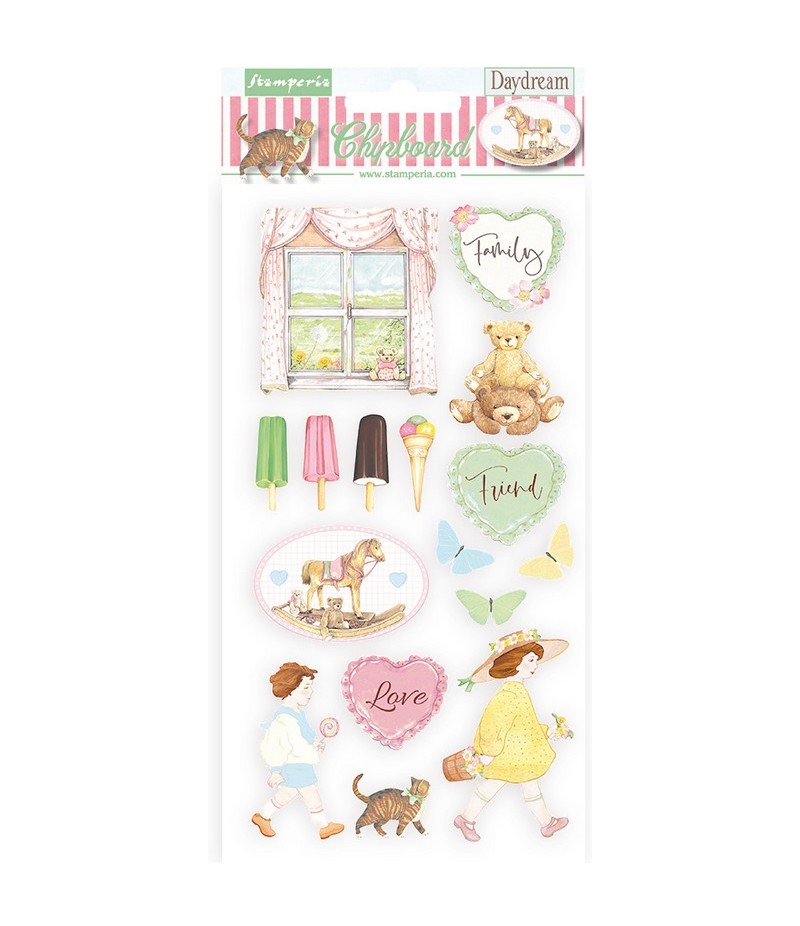 Plaque de 16 embellissements en carton - Collection DAYDREAM TOYS de STAMPERIA - DFLCB53.