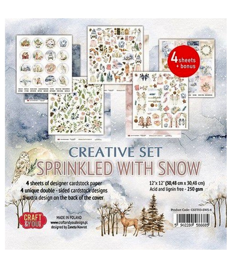 Bloc de 4 feuilles de papier double face (2 motifs) sans acide de la marque Craft & You + 1 bonus au dos de la couverture.