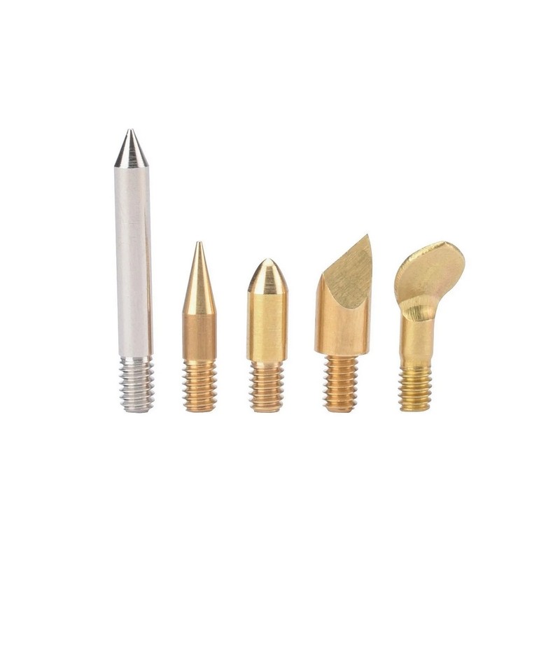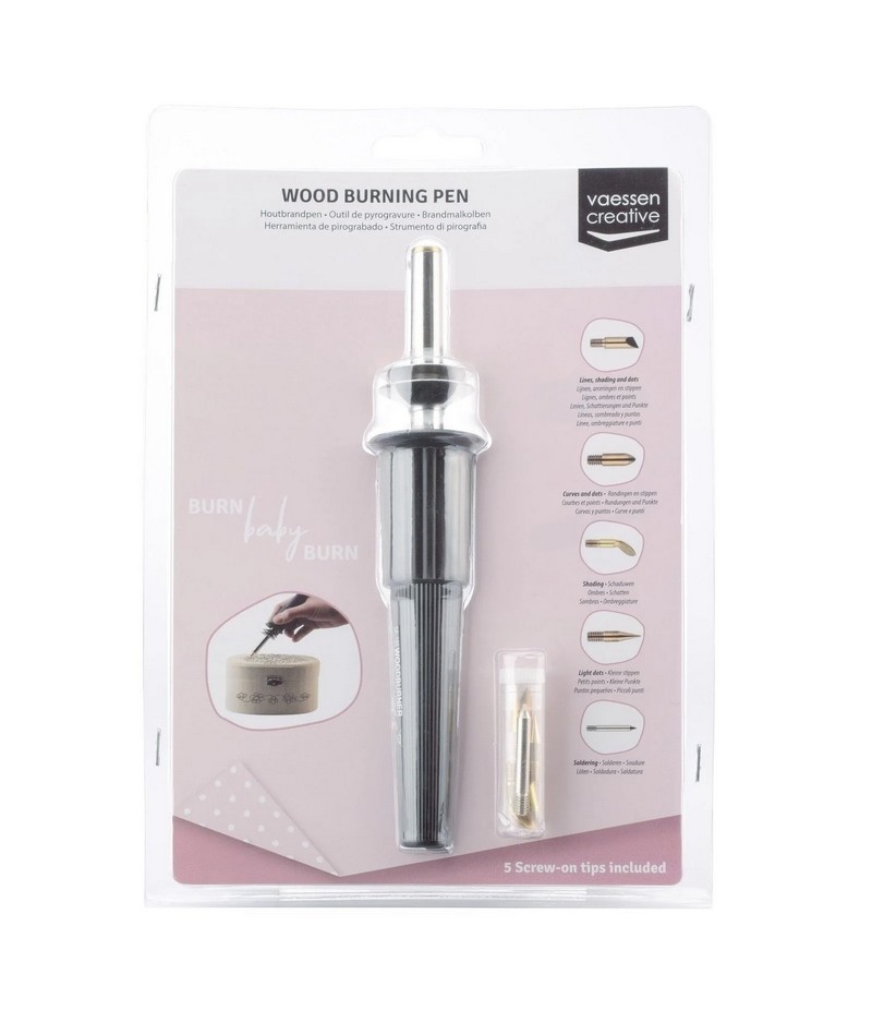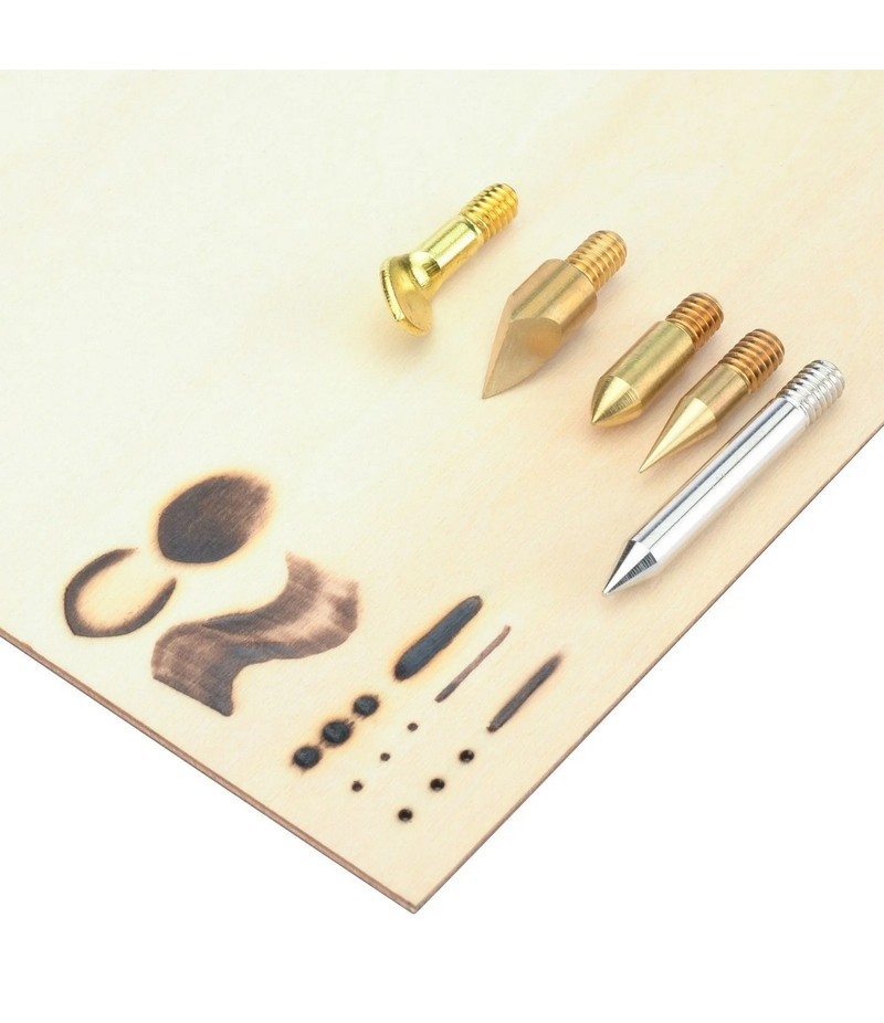 Il est livré avec 5 embouts pour différents effets (embout universel, un pour l'ombre, un pour l'écriture, un pour les lignes fines et un pour la soudure), un capuchon thermo-protecteur et un support pour poser l'outil.