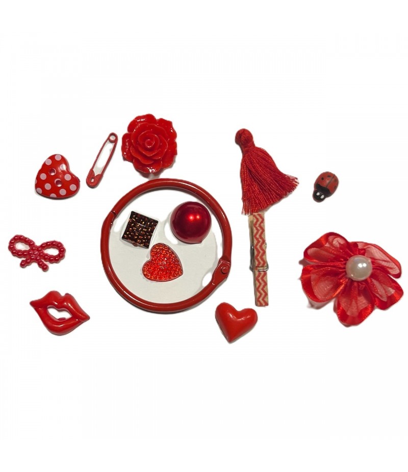 Lot de 14 embellissements en plastique, bois, tissus, résine, métal, bois...
