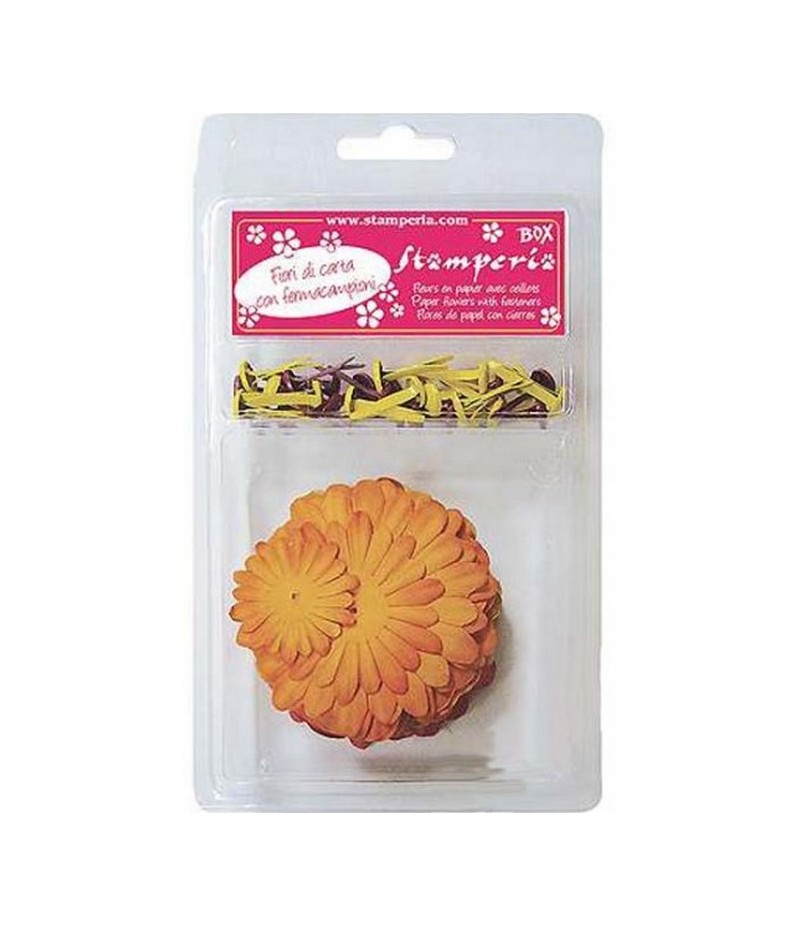 56 Fleurs en papier et 30 oeillets (couleurs jaune et bordeaux) - 3 formes de fleurs, 3 couleurs (abricot, orange et rouge) et 3 tailles de fleurs.