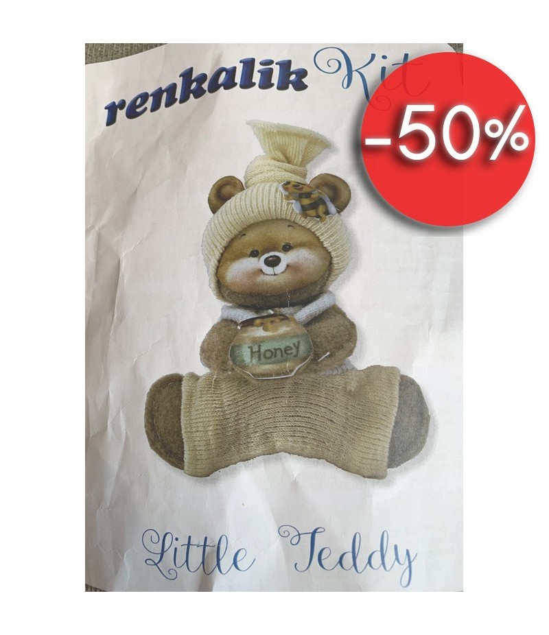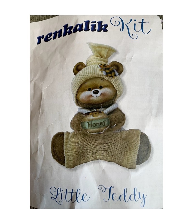 Kit pour réaliser un petit ourson en feutrine et tissu. Le kit comprend la feutrine, du tissu, du rembourrage, de la mousse avec le visage et un pas à pas.