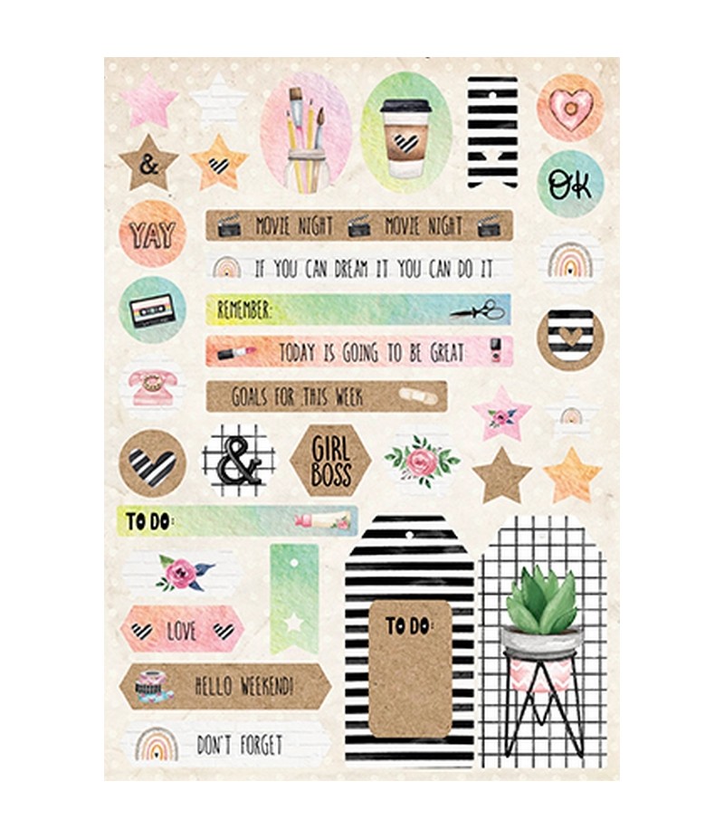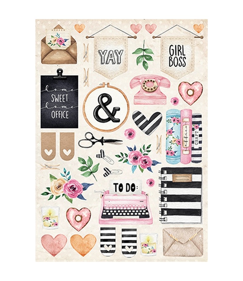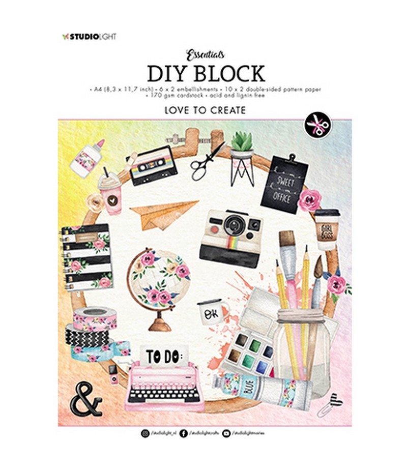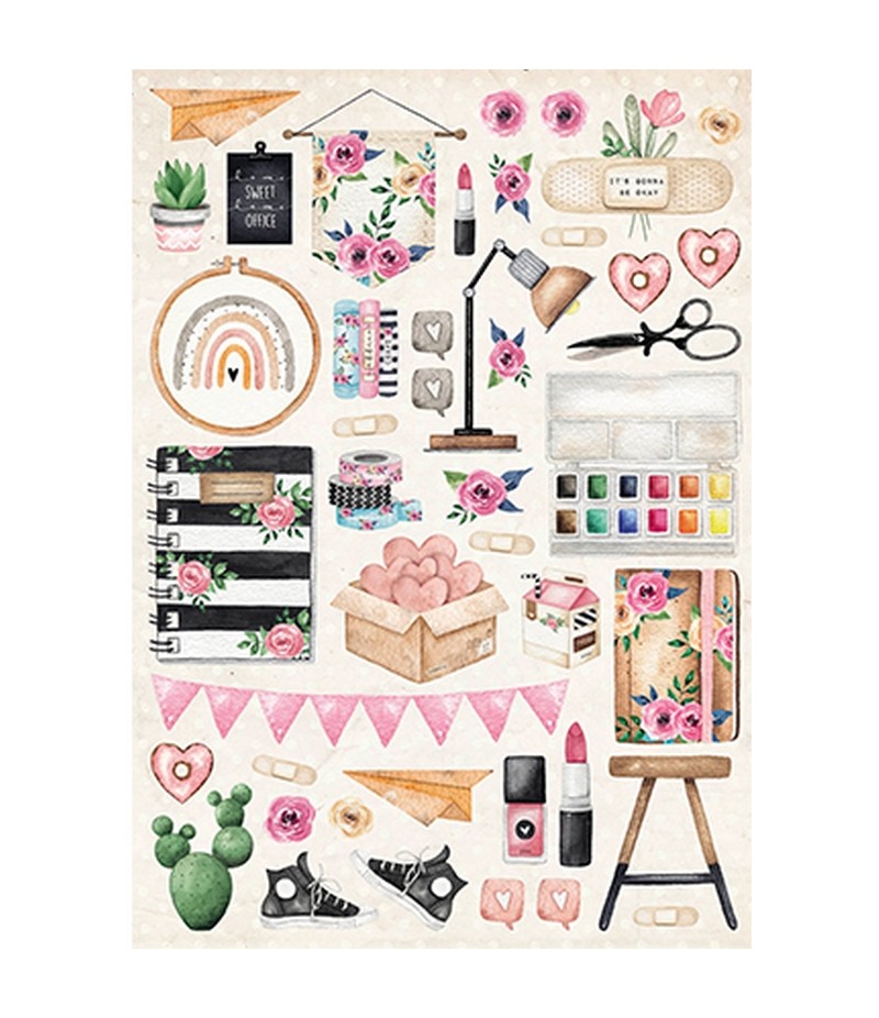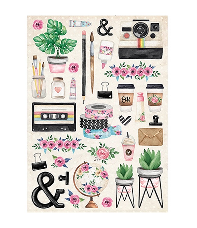 Bloc de 32 feuilles comprenant : 20 papiers imprimés (10 motifs x 2 feuilles), 12 feuilles de dies-cuts prédécoupés (6 motifs x 2 feuilles).