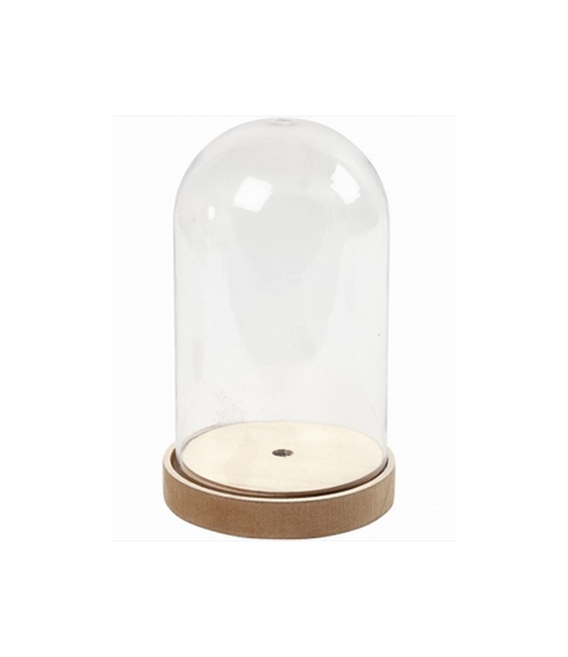 Cloche en plastique transparent avec pied et plateau en MDF. Peut être alimenté par une guirlande de lumières à piles (réf 43413) .