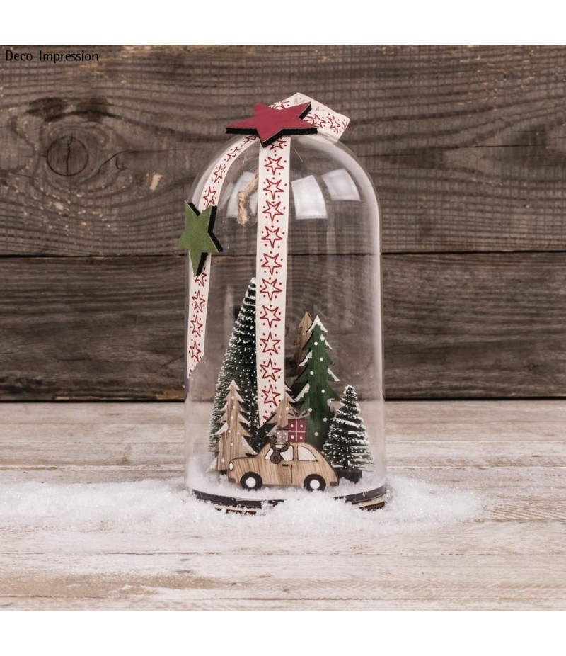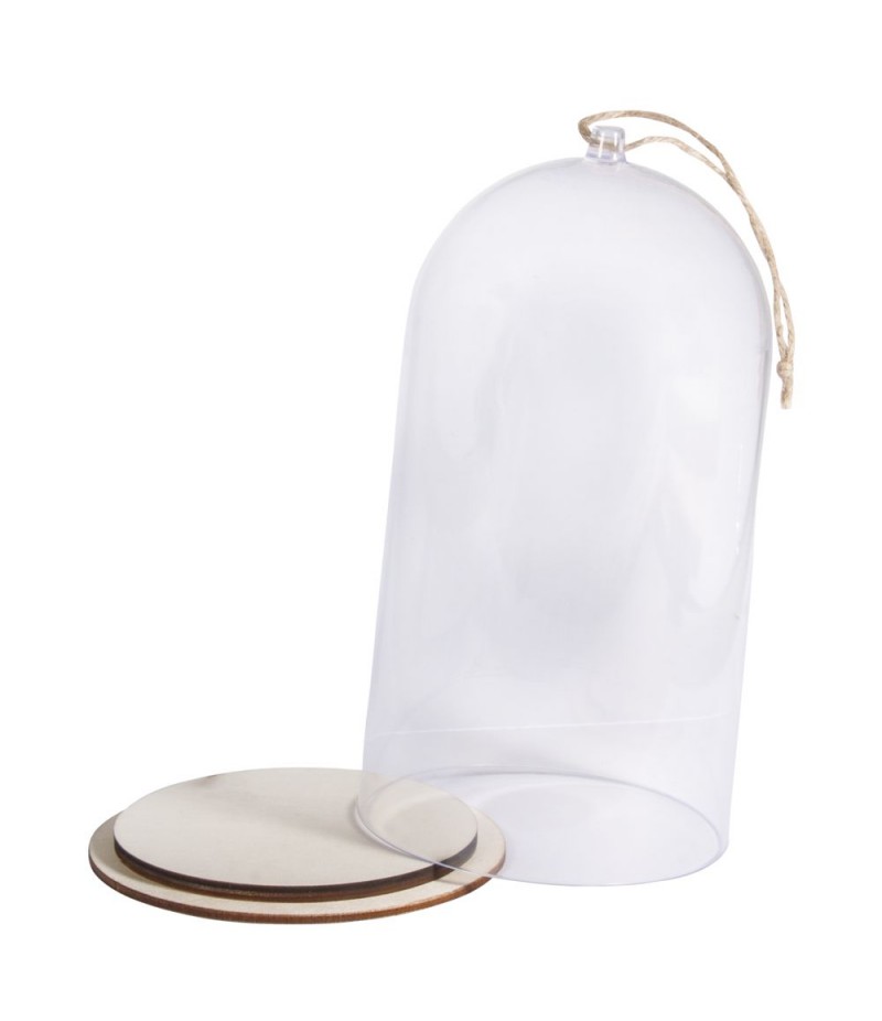 Cloche en plastique avec son socle en bois. Petite accroche en métal sur le dessus de la cloche.