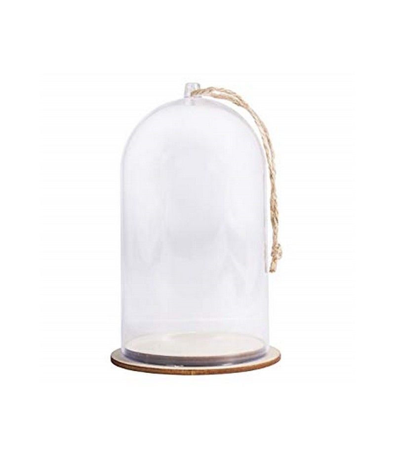 Cloche en plastique avec son socle en bois. Petite accroche en plexi sur le dessus de la cloche.