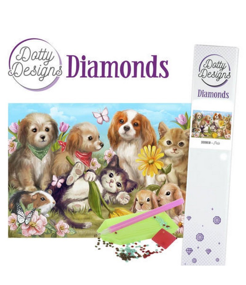 Kit Diamonds Painting de Dotty Design comprenant une toile pré-imprimée avec une peinture réaliste. Chaque paquet contient suffisamment de pierres de couleur, une toile avec un motif et un stylo, une pincette, de la cire et un plateau.