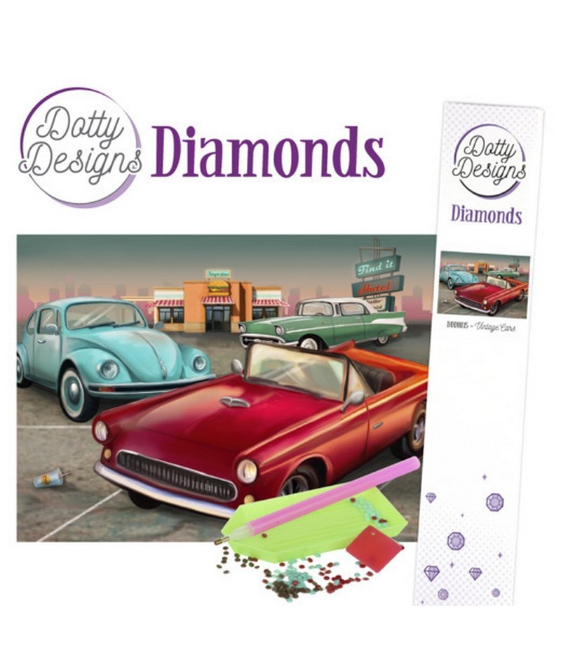Kit Diamonds Painting de Dotty Design comprenant une toile pré-imprimée avec une peinture réaliste. Chaque paquet contient suffisamment de pierres de couleur, une toile avec un motif et un stylo, une pincette, de la cire et un plateau.