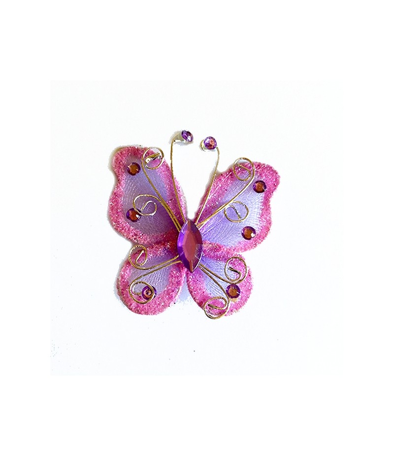 Embellissement papillon avec touches pailletées, fil alu argenté et strass.