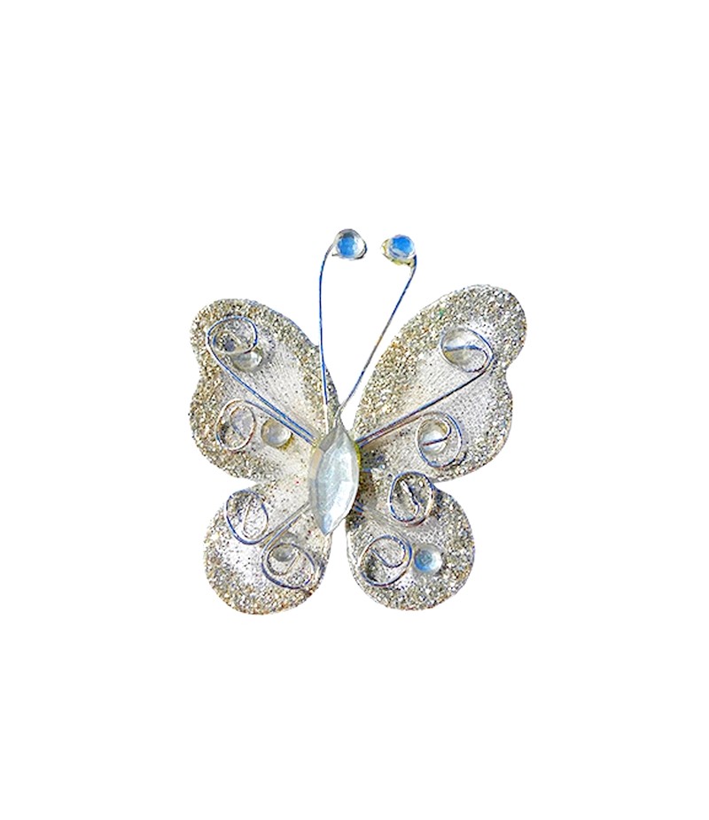 Embellissement papillon avec touches pailletées, fil alu argenté et strass.