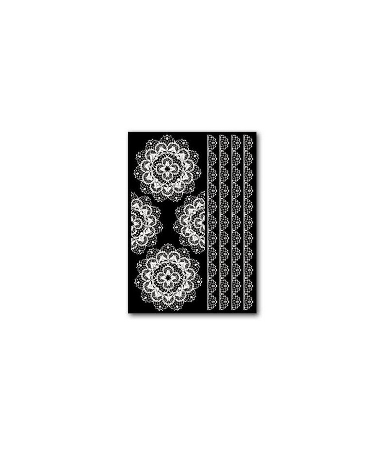 Utilisation : décollez le motif de la pellicule noire, découpez le motif désiré et placez le sur le support. Pour transférer l'image, il vous suffit de frotter avec un plioir sur le motif et de retirer délicatement la pellicule transparente.