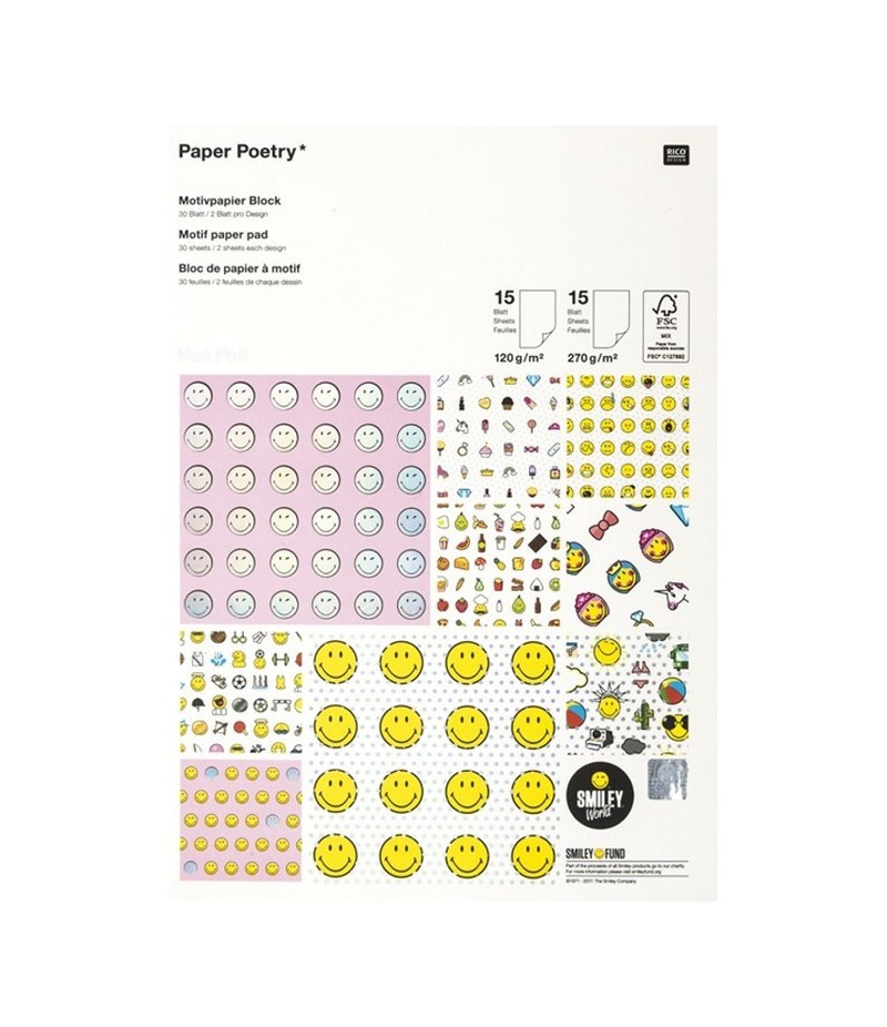 Bloc de 30 feuilles format A4 - 1 seule face - 2 feuilles de chaque modèle, avec des motifs brillants.