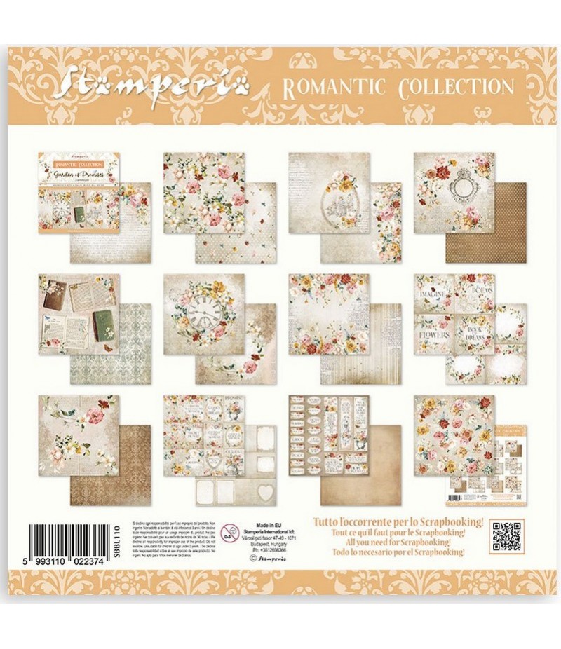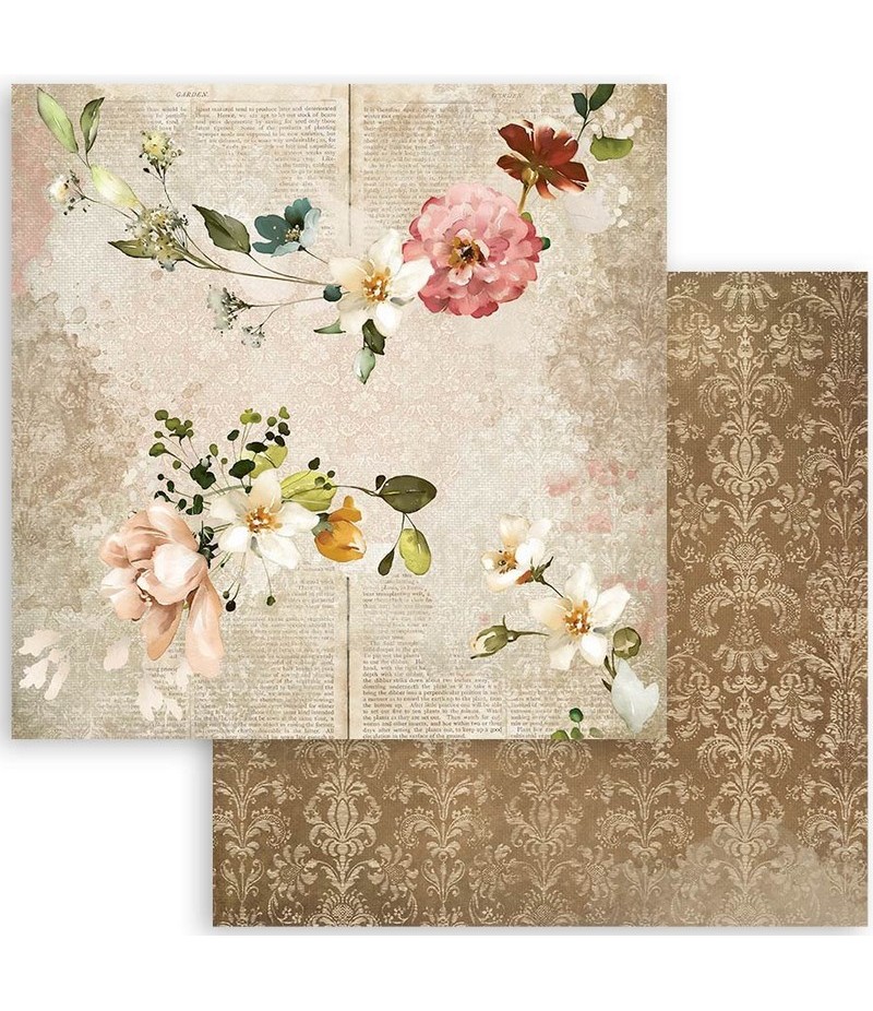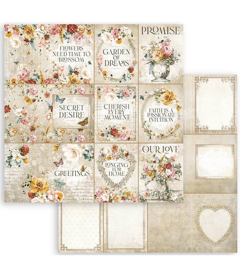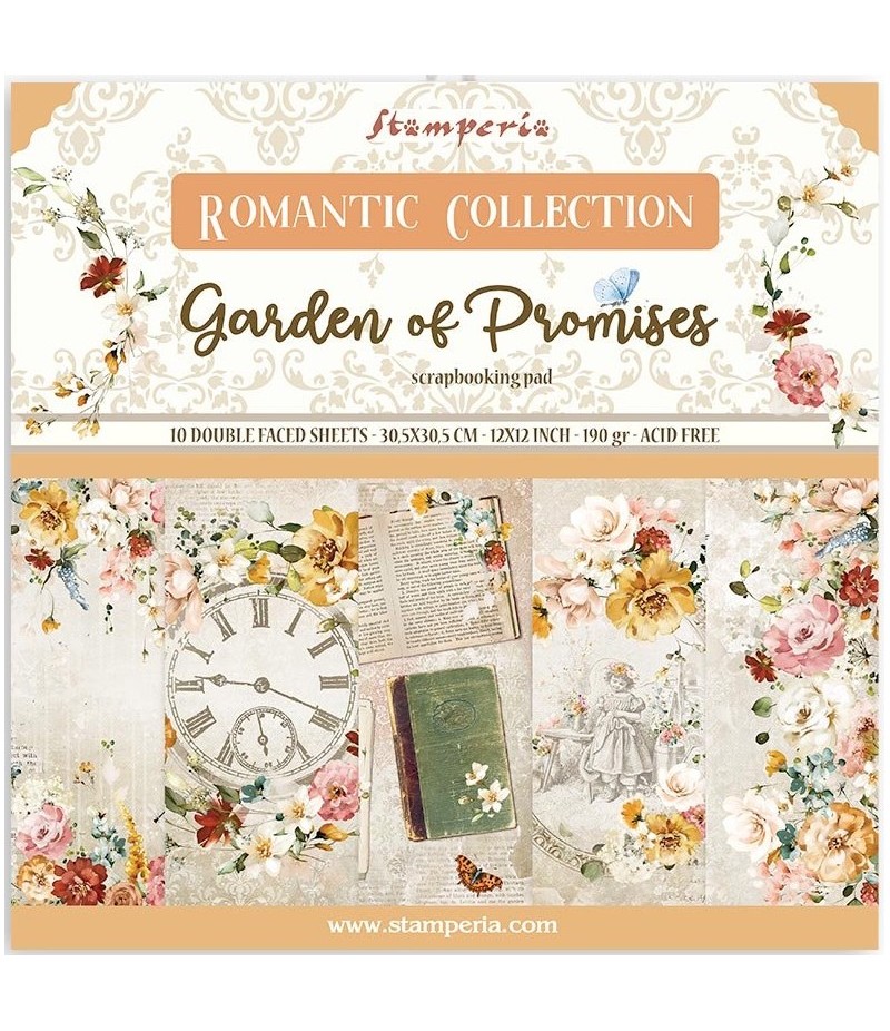 Bloc de 10 feuilles de papier double face (2 motifs) et 2 bonus sur les couvertures, sans acide. Nouvelle Collection ROMANTIC GARDEN OF PROMISES - STAMPERIA SBBL110