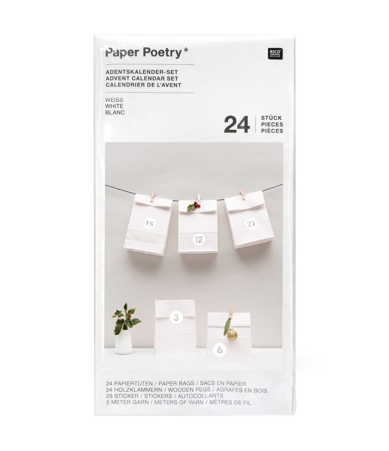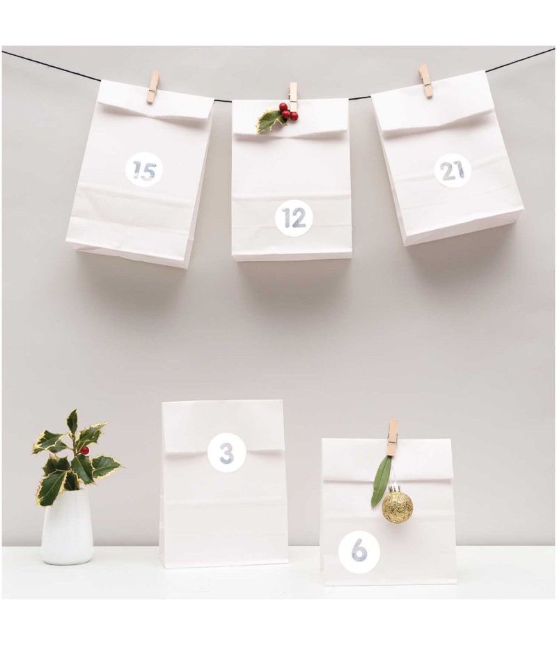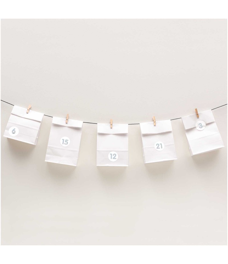 Lot de 24 petits sacs blancs, 24 pinces en bois, 28 stickers et 2 mètres de fil pour créer facilement vos calendriers de l'avent.