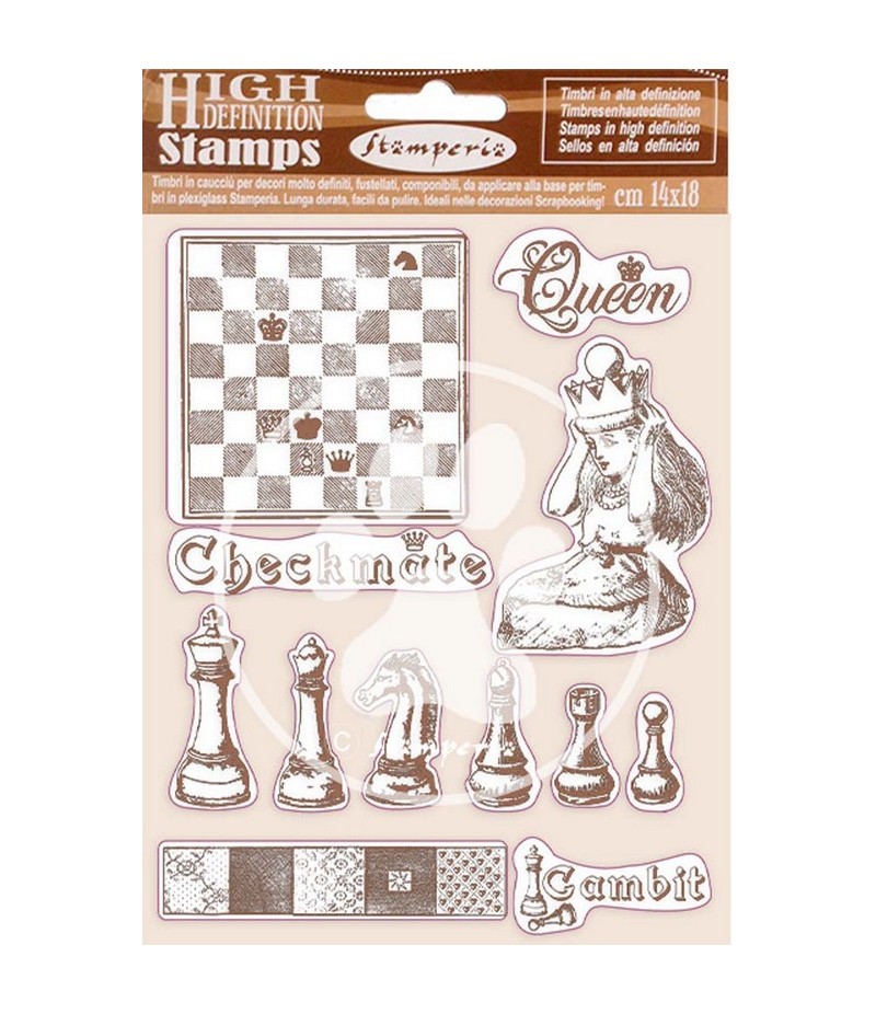 12 Tampons en caoutchouc Haute Définition. A utiliser avec un bloc acrylique. Collection ALICE THE LOOKING GLASS de STAMPERIA.