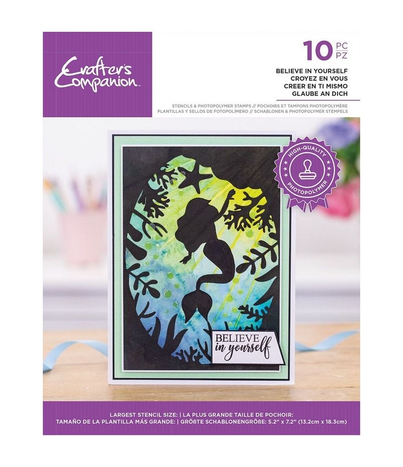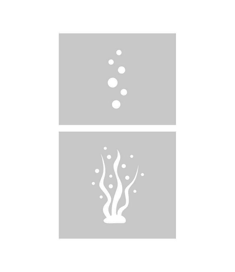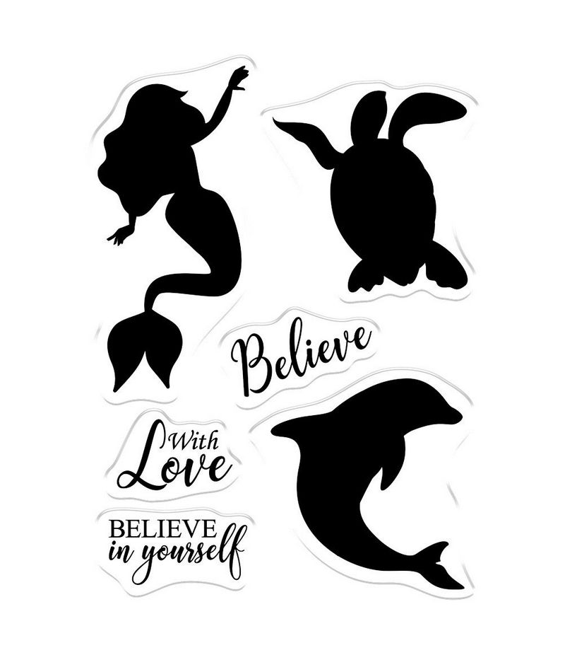6 tampons transparents à utiliser avec encreur et bloc acrylique et 4 pochoirs en plastique souple.
