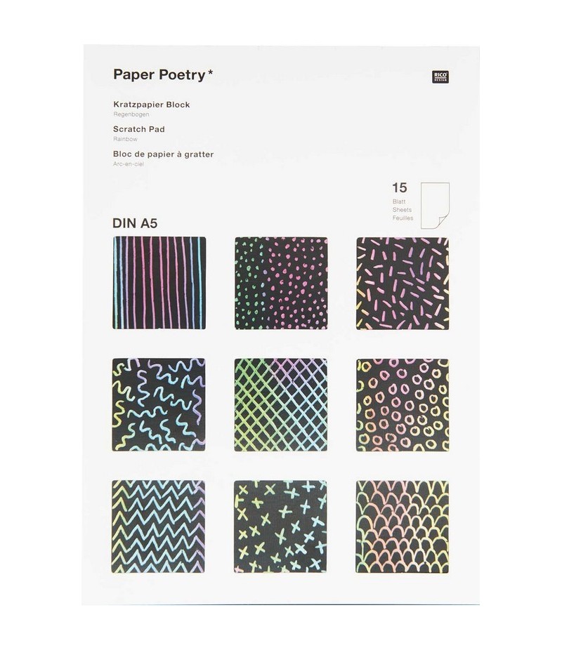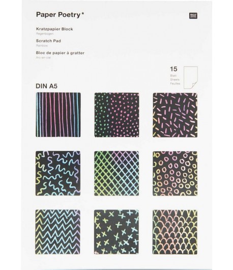 Assortiment de 15 feuilles de papiers noirs à gratter (1 seule face). 10 motifs différents dans les tons arc en ciel.